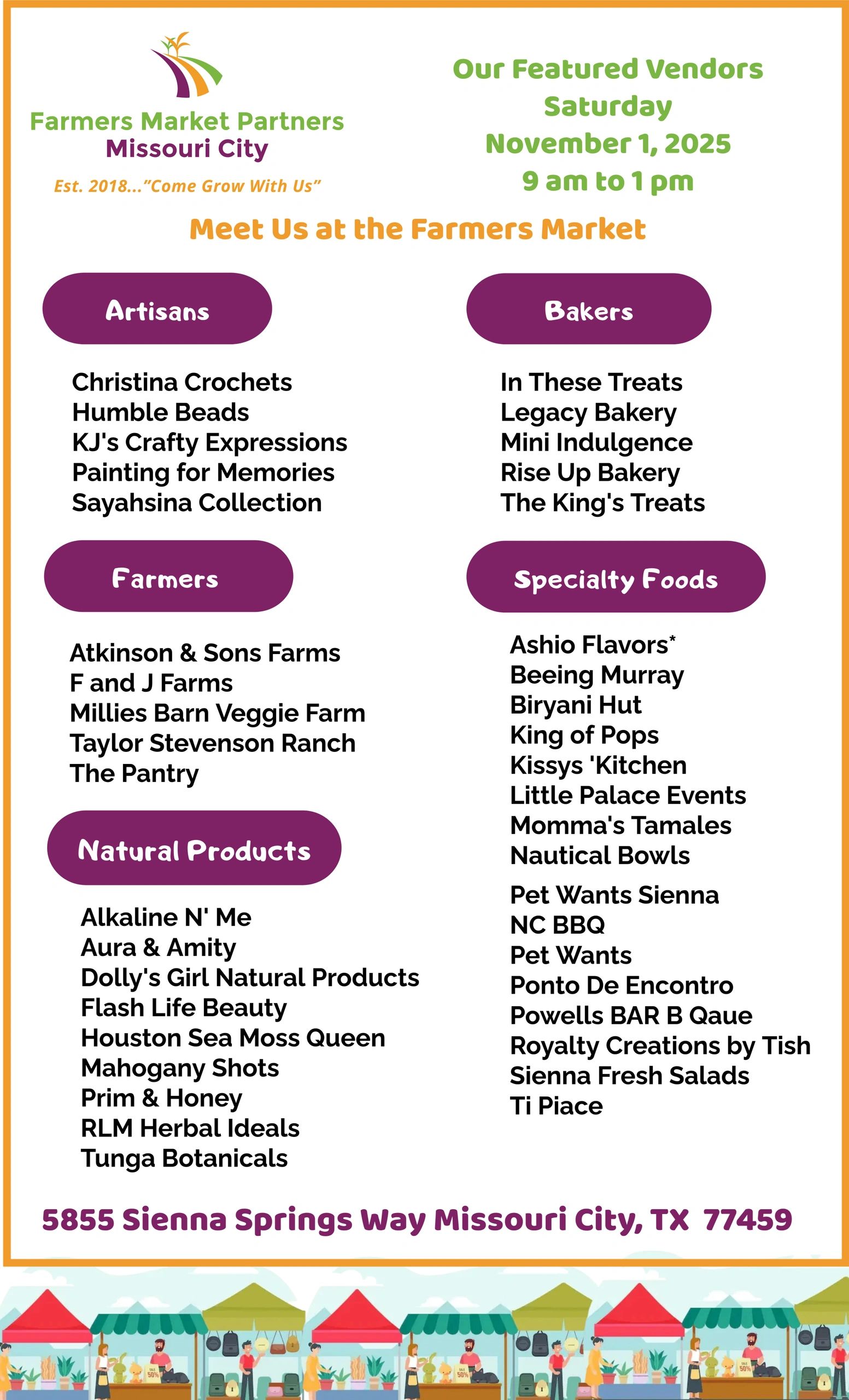We love all our vendors. These are the featured vendors for November 1, 2025. Click the link below on Saturday morning . You will find the updated Featured Vendors Business Profiles and Booth location for the market day. Thanks for your continual support.