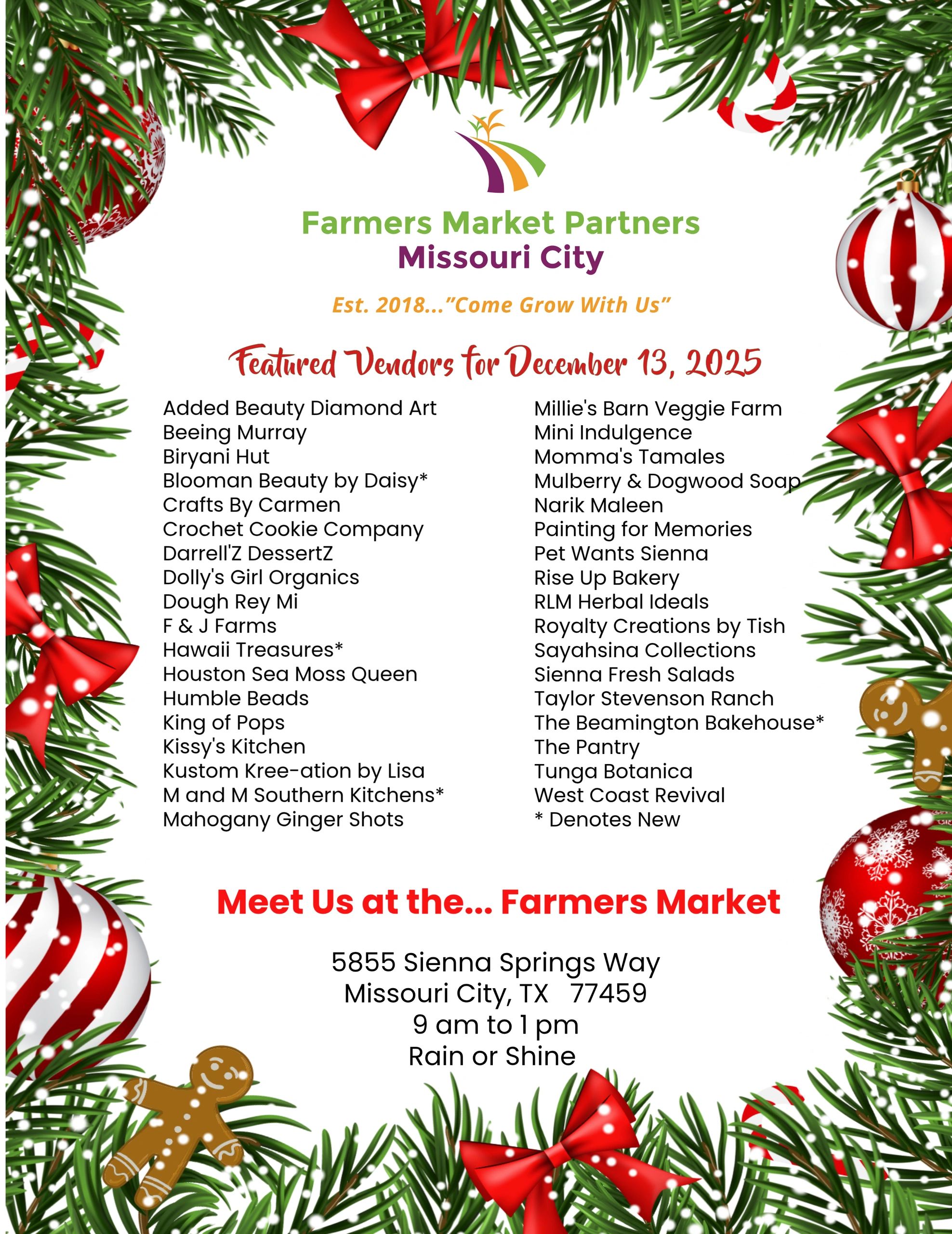 We love all our vendors. Listed are Our Featured Vendors for December 13, 2025. We will post the updated list of our December 20, 2025 Featured Vendors Saturday morning. Click the link below on Saturday for the vendor list, vendor profiles and vendor location map Thanks for your continual support.